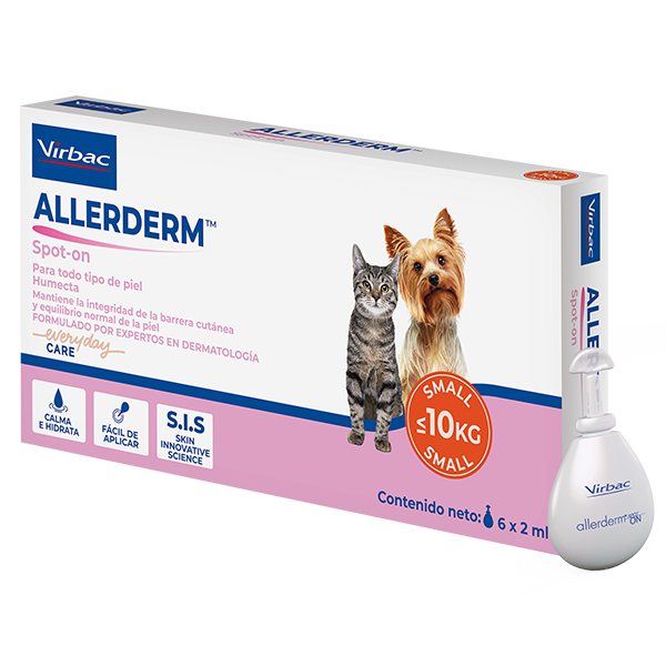Desarrollado con un Complejo Lipídico Cutáneo compuesto por ceramidas, ácidos grasos y colesterol, Allerderm® Spot-On imita la composición natural de la piel de perros y gatos sanos. Este tratamiento tópico avanzado refuerza la barrera protectora cutánea, favoreciendo la hidratación, reduciendo la sensibilidad y mejorando la capacidad de defensa natural de la piel.